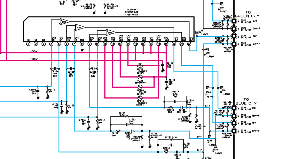 а за вертикаль зеленого цвета отвечает соседняя.Насколько я понял, то обозначение контактов GT25 и GT26 - GH - green horizontal, и сигнал идет с крайней микрухи (на схеме ICZ103),