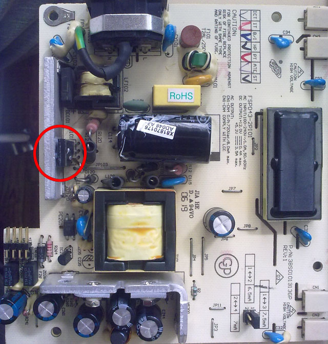 Принесли блок питания от монитора (фотка прилагается). Кто изготовитель не знаю, так как монитор из терминала для оплаты услуг. Там найти какие-то сведения о марке не удалось.