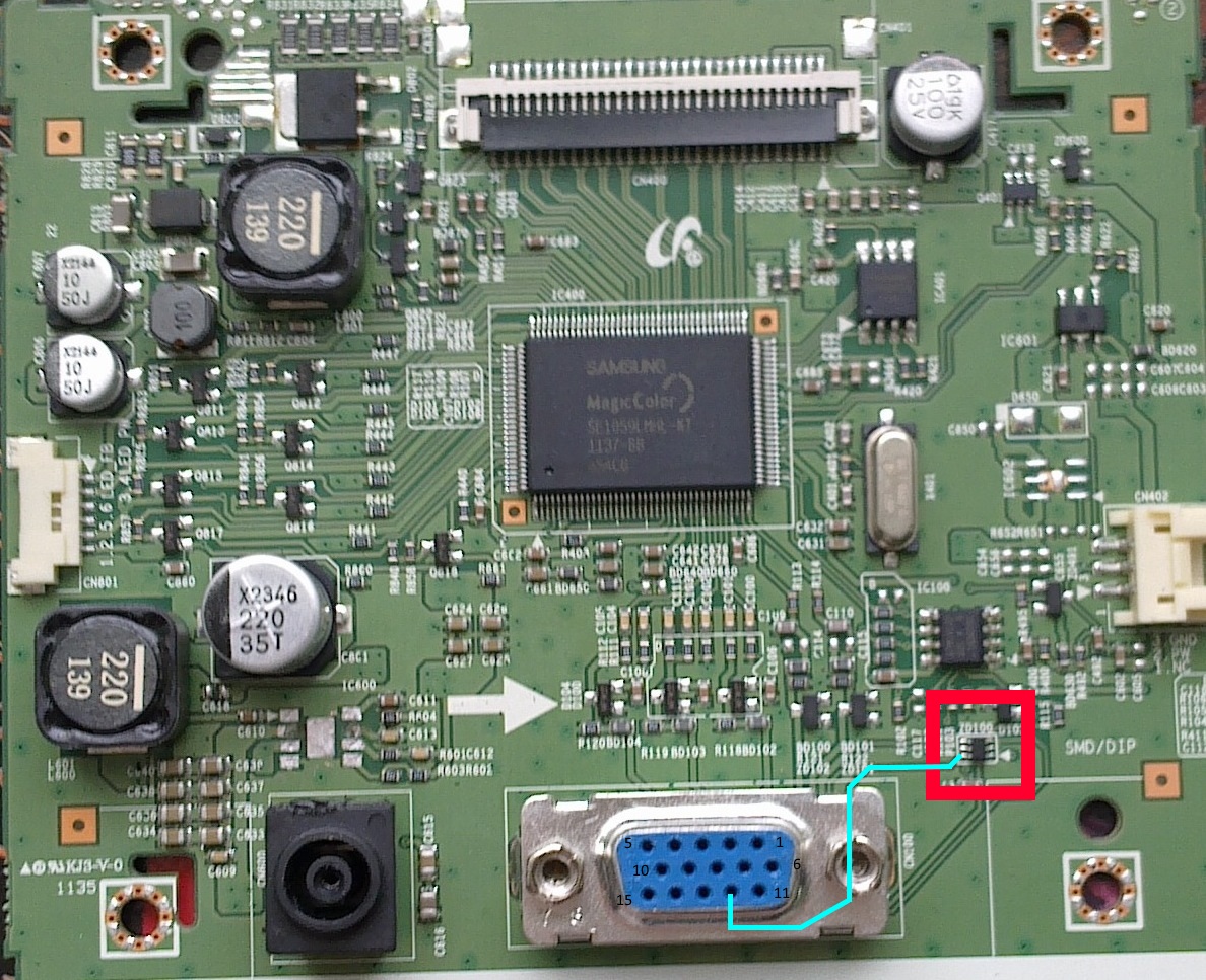 | Наверное с прошивкой EDID восьминогая, та что выше. На ней должна быть написана полная хрень, так как это Самсунг. На само деле там должна быть 24хх микросхема. А то что сгорело возможно был ключ по питанию или аналоговый стабилизатор. |
