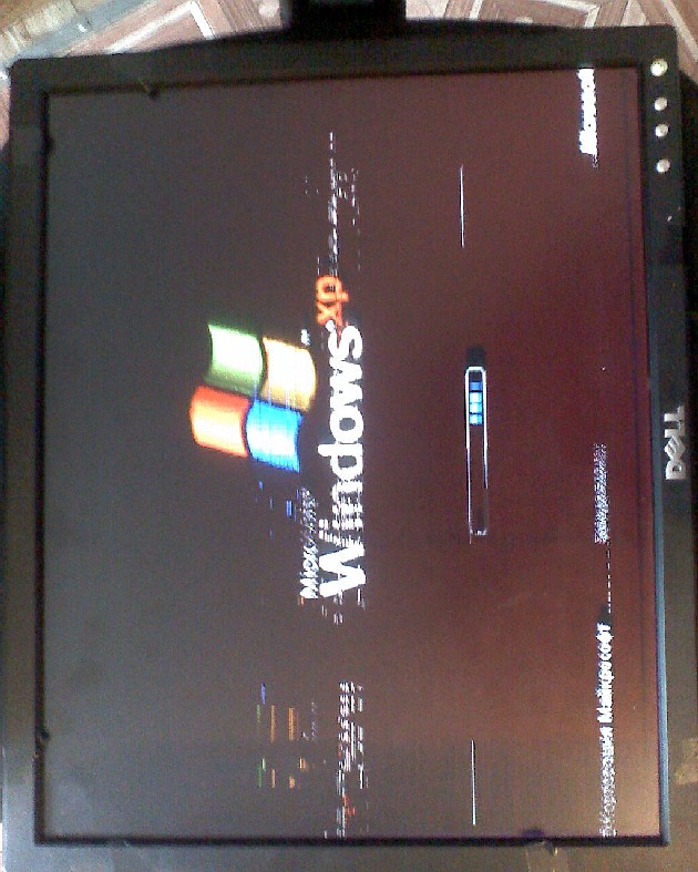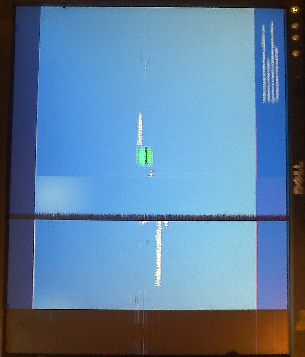 После включения на изображении сильные горизонтальные шумы, слева по экрану сверху вниз темная полоса без изображения. Посреди экрана вертикальная полоса, изображение сдваивается относительно этой полосы. По всему изображению сильные искажения.