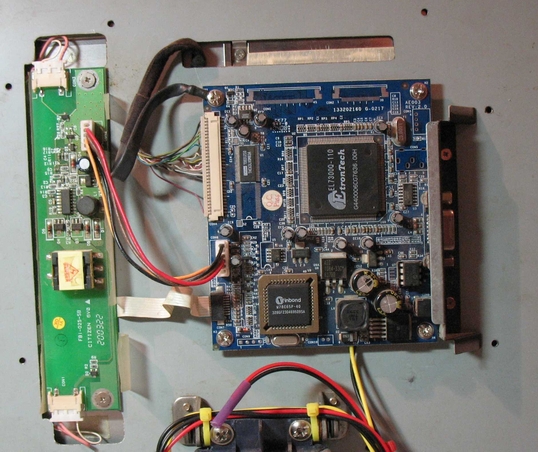 Нашел в закромах родины 15" мониторчик без корпуса. На фото потроха. Монитор работает, но платы с кнопками управления нема, а очень-бы хотелось.