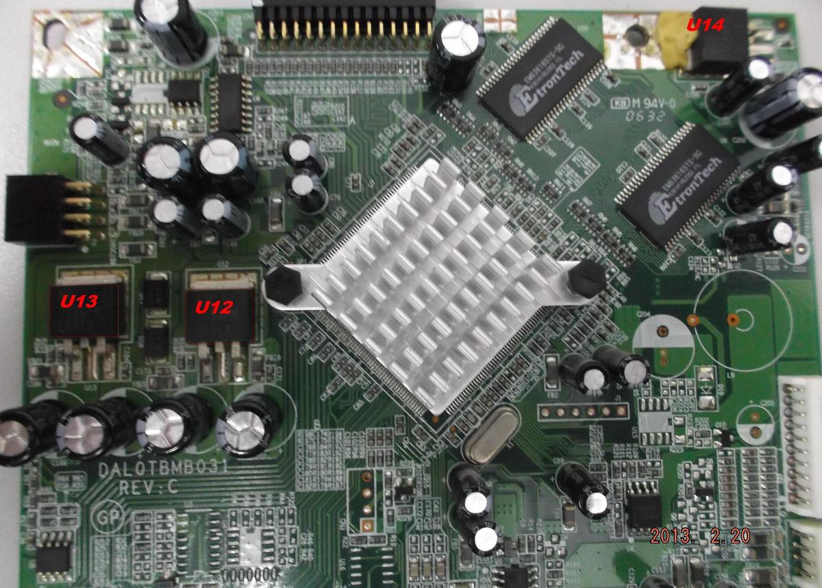 На ногах стабилизаторов(aic 1084pm) U12,U14 на входе 5 вольт на выходе 2,1. на U13 на входе 3,5в. на выходе 0,5в.