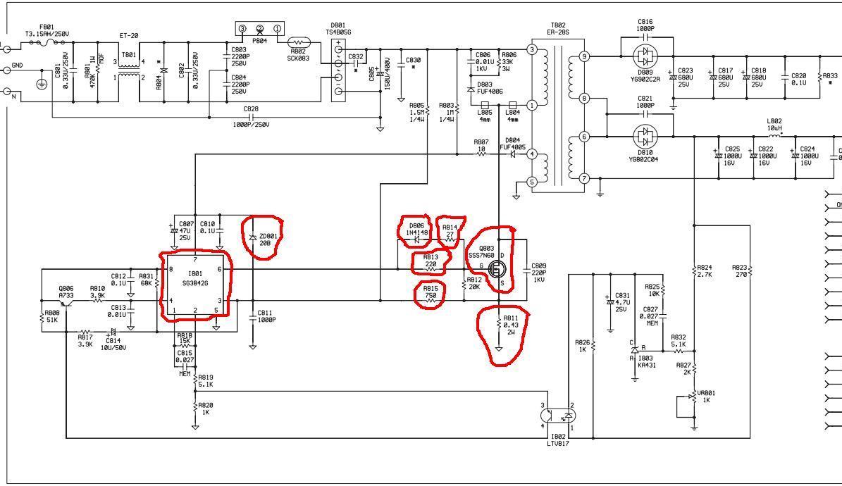 Здравствуйте! В мониторе NEC LCD1701 сгорел блок питание. Сгорел транзистор sss7n60b, четыре резисторов и один стабилитрон и диод, все это я заменил но в итоге на вторичной обмотке трансформатора нет напряжения. Потом перепроверил все резисторы, диоды, транзисторы, заменил задающий генератор, но все так же ничего не изменилось. На схеме я выделил что заменил В чем может быть дело ?