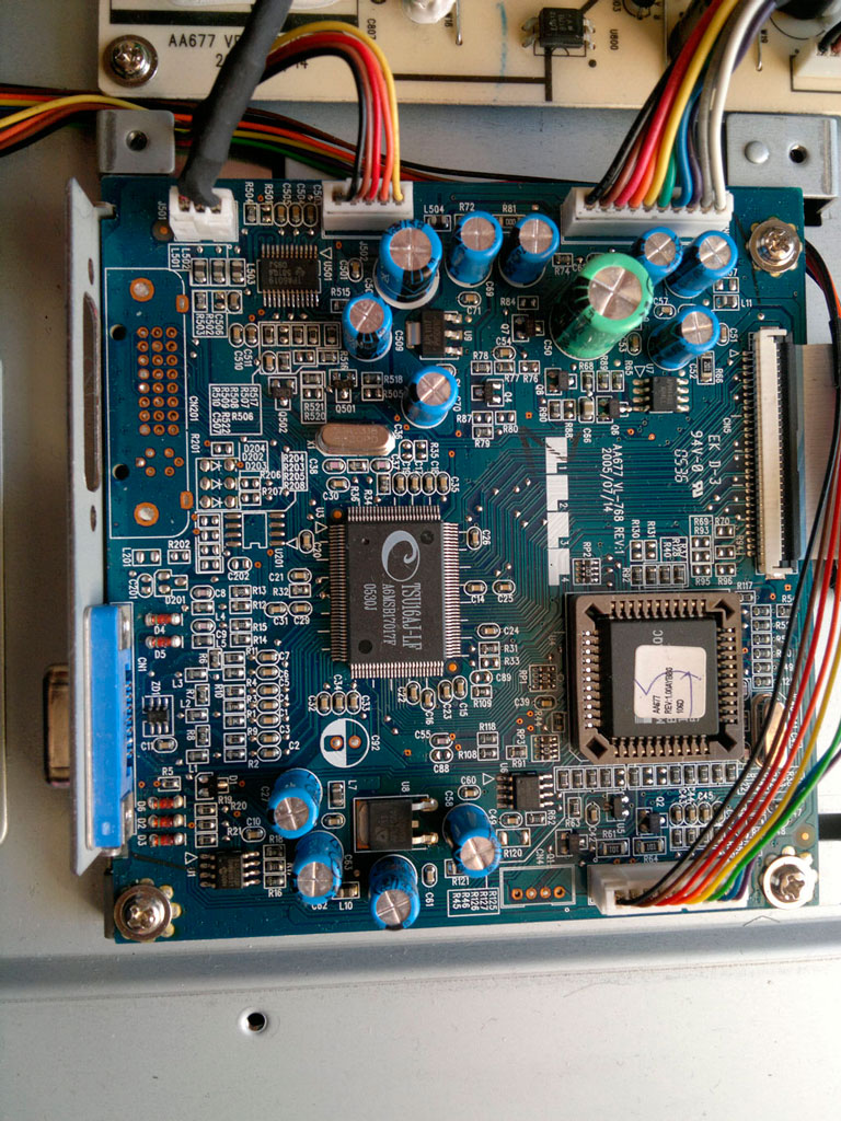 Принесли монитор, при включении в сеть загорается надпись "Acer" и изображение соответственно пропадает и гаснет светодиод на кнопки включения. После проверки дежурное питание +5 В есть. OZ964 в защиту не уходит. После вы пайки резистора R76 по схеме, монитор включился загорелась надпись "Acer", после чего экран становится белым и стоит в таком состоянии, после повторного включения в сеть картина повторяется ( это с отпаянным резистором). Может прошивка слетела? Стоят две 24С02 микросхемы, и нигде не могу найти прошивку на этот монитор.