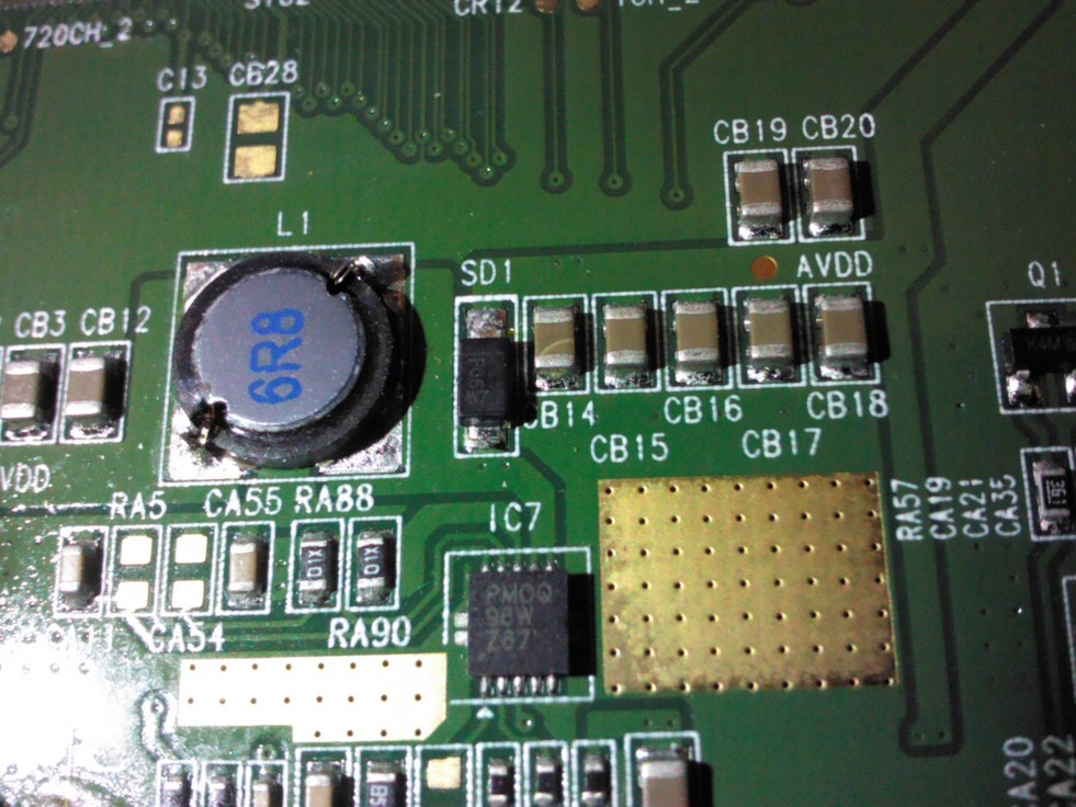 | Диод и катушка греются из-за пробоя керамики па цепи AVDD (CB14-CD20) или других кондеров, расположенных возле шлейфов. |