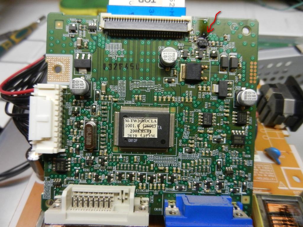 Здравствуйте.Принесли на ремонт монитор Samsung T200 LS20TWHSUV/EN .Монитор не включался и вонял горелым.При вскрытии обнаружил два вздутых конденсатора 25 В на 470 uF в БП., и сгоревшую деталь на второй плате. Маркировка на этой детали не читаема,схемы нет.Требуется помощь в опознании детали под красной стрелкой.