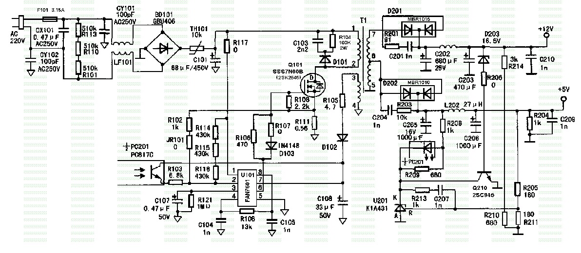 | Схема блока питания не точна. Как минимум, R205, R211 - 1.8кОм, R210 - 6.8кОм, R106 - 47Ом. Кто-то множитель неправильно посчитал, рисуя схему. R102 1кОм как и в схеме. |