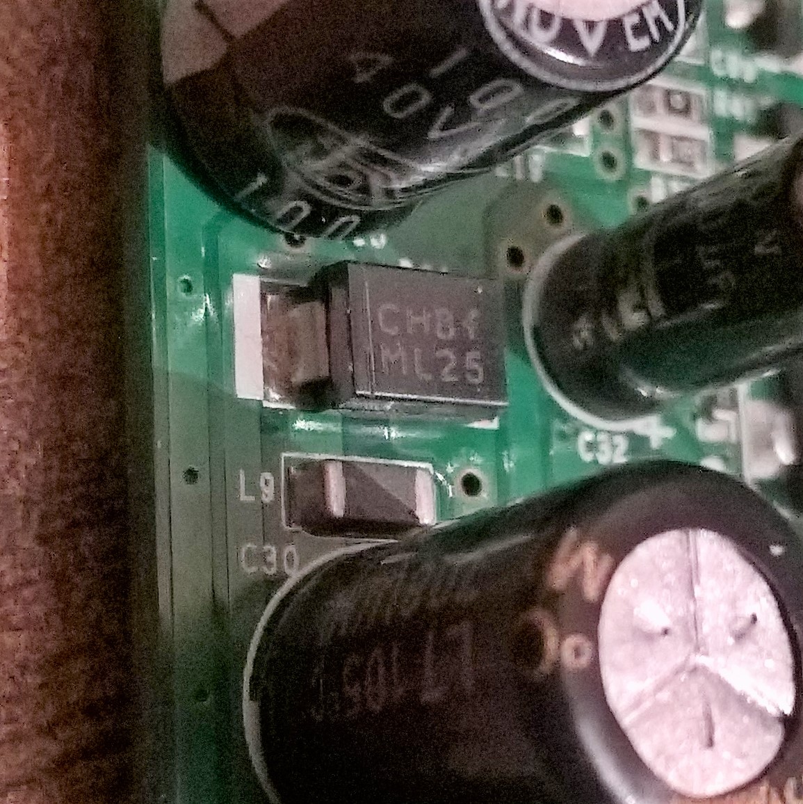 Если бы он был в гугле, или яндексе, или еще в каком то поиске, я бы не задавал тут вопроса. В поиске показывает по "ML 25" диод 600в 2а но я думаю зачем сюда ставить 600в если плата 5в. На ней кондеры стоят 15в, этот конденсатор что на фото я заменил, небыло на 15в я поставил на 40в, пусть он не вводит вас в заблуждение, а диод этот не звониться в обе стороны.