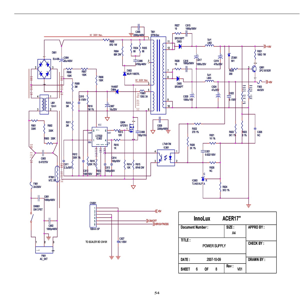 При включении напряжение питания ламп с бп скачет от11в до 20в. питание платы скалера от 3 до 5.1в. при этом светодиод мигает желтым примерно минуту. Далее монитор включается и работает. Напруги становятся 15.3в и 5.1в. Если выключить и сразу включить то включается штатно. если подождать 5 минут то опять мигает желтым минуту.Если подключить лампу 12в 5вт на питание ламп то включается сразу и всегда. Если отключить шлейф матрицы то тоже включается подсветка сразу и всегда. Пробовал запитать от компьютерного бп 12в и 5в то включается сразу и всегда. Такое впечатление, что не работает стабилизация в бп. Пробовал подкинуть другую tl431 и оптопару не помогло. Стабилитрон на 9.1в проверял (жалко заменить нечем). На текущий момент заменены уже все электролиты на плате.Даже матрицу с лампами подменял но увы.
