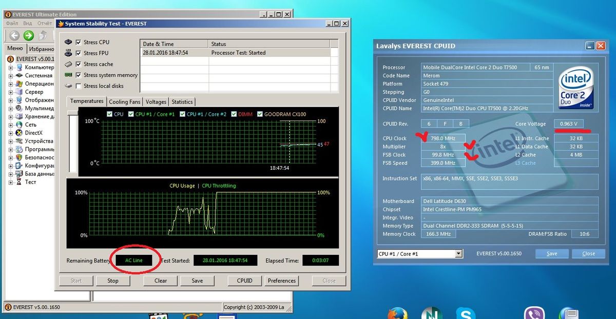 Теперь небольшое пояснение, дома валялся д620 ый делл сильно покоцаный и уставший, типа на запчасти, и у него тоже был блок питания только на 65 ват и тоже не определялся, тоже был перепаян шнур в двух местах но не работал,точнее не определялся в биосе, вот я вторично перепаял возле разъема, выкинув сетевой фильтр и он определился , этот скрин работы на 65 ватном - ну и риторический вопрос - какого х.. он ограничивает множитель с (12 до 11) и частоту (с 2394 до 2194) и напряжение процесора (с 1.41 до 1.36) при работе от 90 ват??? загадка ДЕЛЛовитых инженеров...