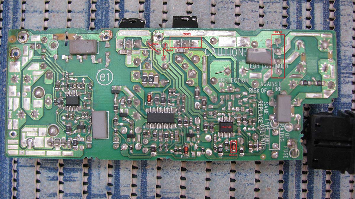 Добрый день ув. Коллеги. Пришел на ремонт такой же Адаптер PA-1900-24. Вскрытие и прозвонка показали, что пробит в короткую 2 диода в диодовом мосту(D050), малоомные резистоты R014 (0,18Ом); R051 (0,1 Ом) у истоков силовых полевиков, сам полевик в цепи PFC Q001 (2SK3561) диод (LL1N4148), идущий с затвора на 7 ногу (OUT) ШИМ-ки (FAN7528) и наконец сама ШИМ-ка эта FAN7528 выпаянная, как то подозрительно звонится между собой 7-ой(OUT) и 6-ой(GND) ногой в режиме Омметра 65 Ом в обе стороны. Схема из даташит FAN7528, на фото обвел красным детальки, что погорели, чтоб было понятно о чем идет речь (позиционные номера не соответствуют с моими естественно). Все погоревшие детали нашел кроме FAN7528, могу поставить, но боюсь сгоревшая ШИМ-ка опять вынесет полевик или транзистор от которого сама питается.