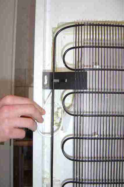 Его придётся вырезать. Если развернуть холодильник, то слева на высоте окончания решётки нужно вырезать участок 7х7см. Извлечь датчик из канала, откусить, вставить в канал новый датчик и припаять его провода к проводам старого датчика, не забыв надеть термоусадочные кембрики. Вырезанное отверстие задуть макрофлексом, дать застыть, срезать вровень с задней поверхностью и залепить липкой фольгой |