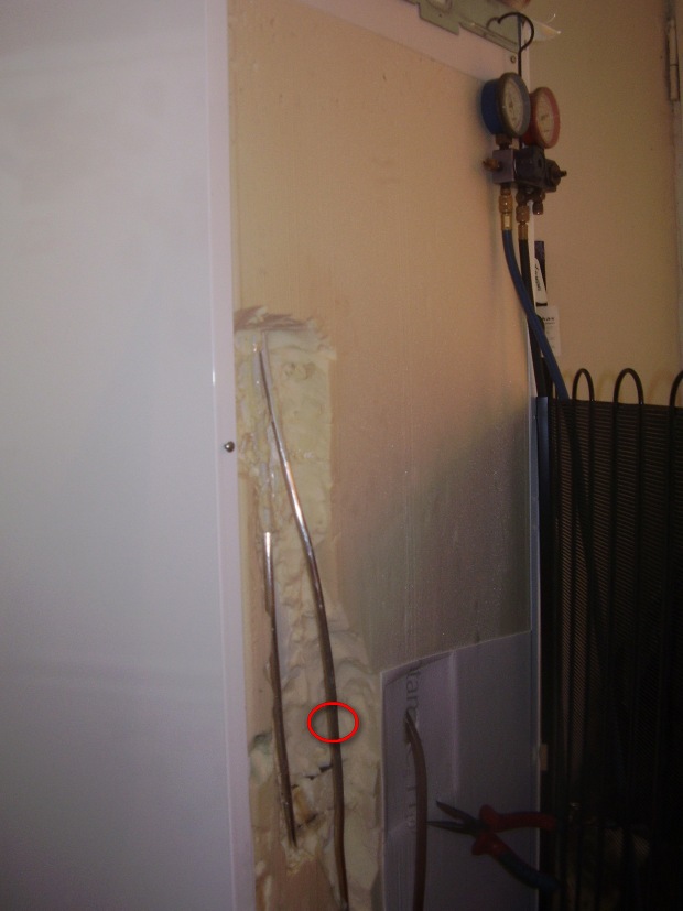 Electrolux model 3851X (МК- внизу frost free с вентилятором- работала ок, а ХК с плачущим исп., перестала охлаждать ) ищу утечку. Раздельно в контур низкого и высокого давления закачал Р134 (в тот момент не было азота) 3 дня давление ~ 5.Если утечка то минимальная. Придётся резать сзади пенопласт.