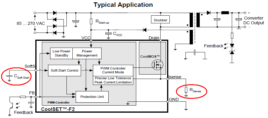 Ёмкость Csoftstart обеспечивает мягкий старт и функцию рестарта.