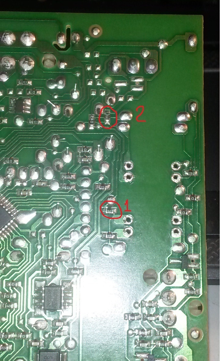 Ошибка CF. Ошибка понятна. Но появилась после перепайки кондера на питании. После долгих поисков и "врагу не сдается наш гордый варяг" найдены сгоревшие SMD резисторы. Но опознать сложно, схему не нашел.