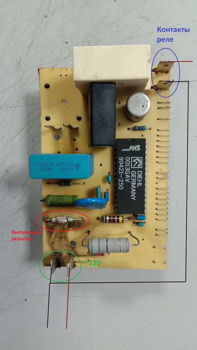 Всем доброго времени суток. Попросили починить таймер на стареньком духовом шкафу Zanussi BMS 641. Я так подозреваю из-за перепада напряжения.выгорел резистор. Сняв таймер обнаружил очень интересную конструкцию. Если я правильно понял всё питается от 220В. Всё что делает этот таймер это замыкает и размыкает реле, провода от которого идут на регуляторы температуры. К сожалению не подумал прозвонить что приходит на провода. Но судя по каталогу запчастей никакого понижающего преобразователя там нет. Про микросхему никакой информации найти не смог, сервис мануала тоже нет. Может кто-нибудь с таким сталкивался, как это вообще работает, и что там должен быть за резистор?