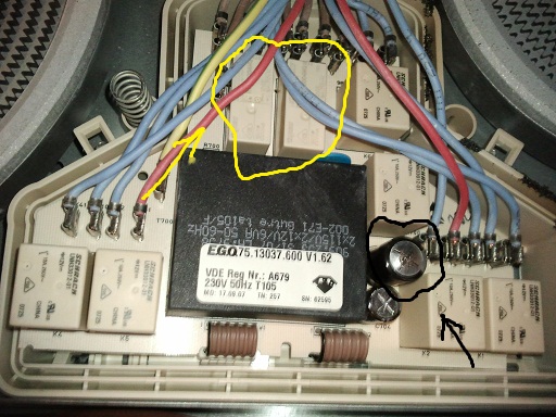 Так как тестера у меня нет и не было, то диагностика была проста: внимательно посмотреть. Обычно у людей на этой панели плохая пайка, что проявляется отказом половины плиты(смотри детали, обведенные желтым), но в моем случае пайка была нормальная, зато оказался вспухшим конденсатор в панели управления(смотри обведенное розовым и черным).