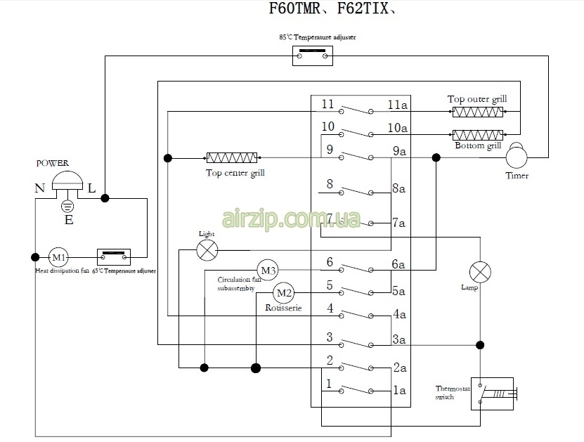 Поступил в ремонт духовой шкаф электрический Pyramida F 60 TMR сер.н. 1105301381 .. прогорел переключатель режимов! .. вызвали с сервиса парня, переключатель принес, но не установил, уехал в Польшу, сами установить не смогли .. сравниванием и прозвонкой .. подключил новый переключатель. Но сзади духовки есть вентилятор, находится вверху духовки, вроде как "охлаждающая вентиляция" ... вот он не работает. Может есть у кого схема подключения со старых переключателей на "новый" .. возможно допустил ошибочку! Прошу помощи!