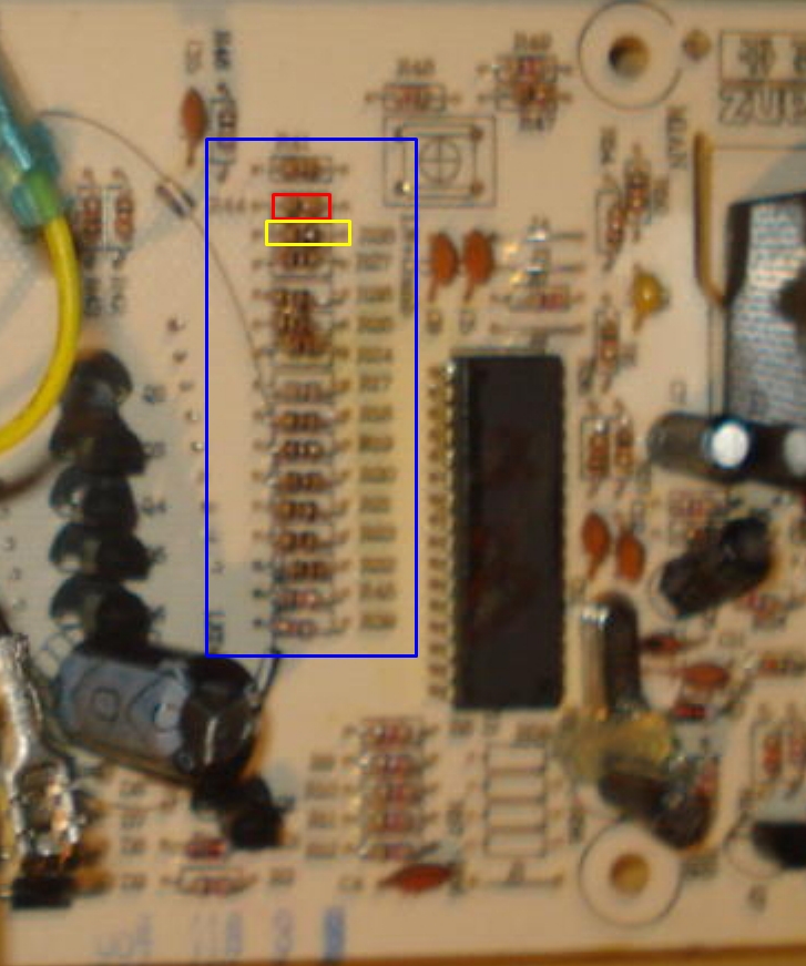 intасt, да, обе кнопки имеют одну общую дорожку - по схеме она выходит на "красный" резистор и далее на вывод микросхемы. Этот "тракт" исправен. Также на красный резистор выходит "жёлтый" - он исправен. Копать дальше без схемы весьма затруднительно.