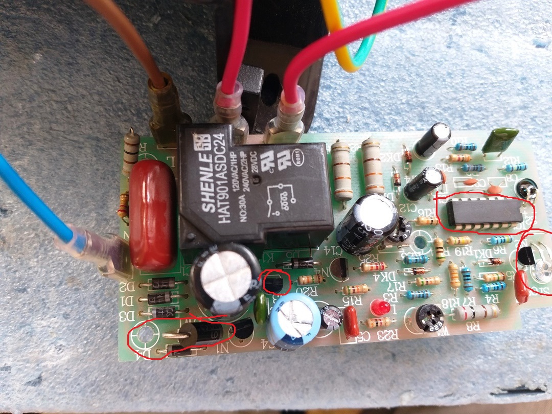 | Реле по моему среднего лица, то есть оно реле.По дорожках от обмотки реле пройдись ,должно быть на электролите 24вольта, а другой контакт на коллектор транзисторного ключа ,базой скорее всего на LM. |