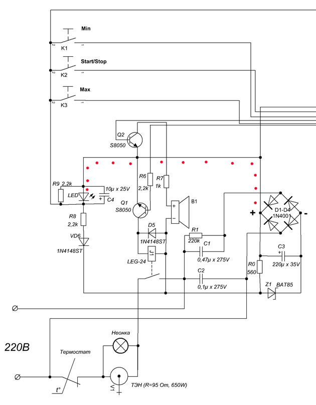 Мы сошлись, что маленькие прямоугольнички (ключи) на рисунках диодов указывают на "плюс". На моем рисунке в посте 01/03/2010 18:11 у диода D5 "плюс" получается справа, как ты и нарисовал на своем рисунке. А на последнем фото, сделанном сразу, еще без перепаек, видно, что справа находится "минус" диода (черный ободок). Вот и получается нескладуха. Тогда получается, что ключ указывает на "минус" и мост был правильно впаян, но тогда не понятно подключение кондера С3 - противоположно мосту. И еще, вот схема уже с перевернутым мостом. При старом подключении, загорался светодиод LED, теперь же, он загораться не должен.