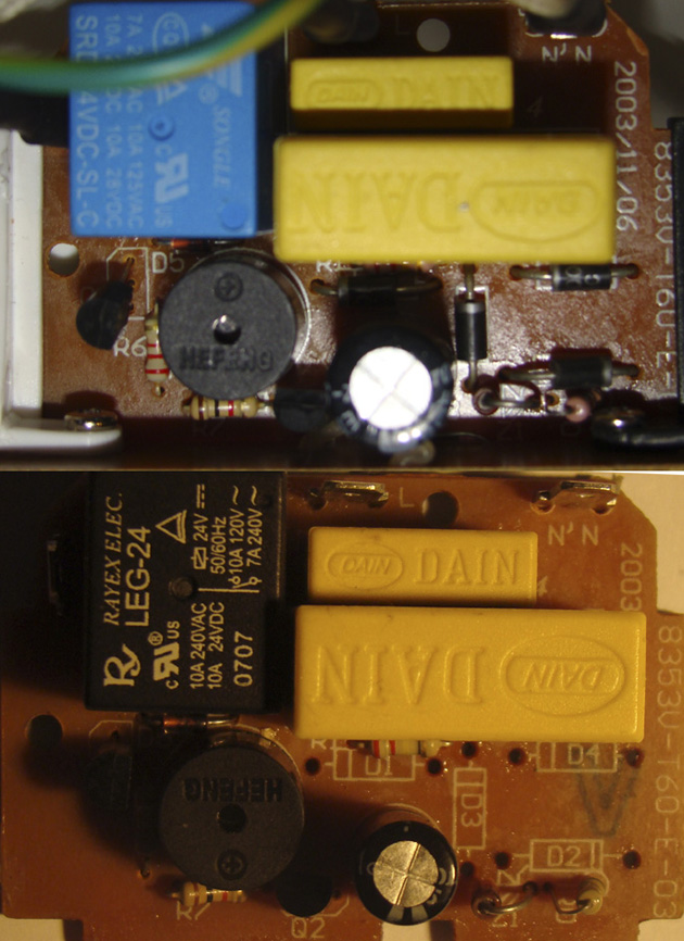 Смешно. Нашли точно такую же байду, 100% рабочая. Верхнее фото-ее плата. Как видишь, только перевернута пищалка. На моей плате она установлена правильно, т.к. издавала звуки. На рабочей человек не смог ничего сказать по этому поводу. Ну и посмотри на наш долбанный мост и электролит. Все, как на самой первой схеме - полярность кондера противоположна мосту и работает, зараза. Может этот кондер стоит, как гасящее сопротивление? Не знаю, тупо скопировать по рабочей плате, а там видно будет?