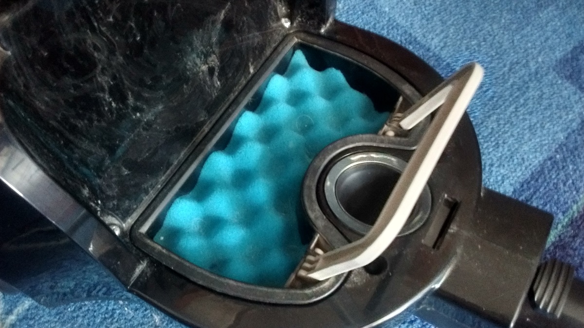 Пробовал пылесосить (в рамке для фильтров, оставил только губку), сетчатый фильтр не ставил. Подсоединил шлангу, щётку. Пыль всасывает, щётка не притягивается. Раньше как было, тяга была огромная, ковёр всасывало (оторвать от щётки не мог). Сейчас вообще не присасывается. Пылесосит не эффективно (приходится по два-три раза пылесосить одно место). Мусор остаётся на фильтре и забивается во внутренней камере для воздуха в чашке контейнера (на фото видно). Так не должно быть!