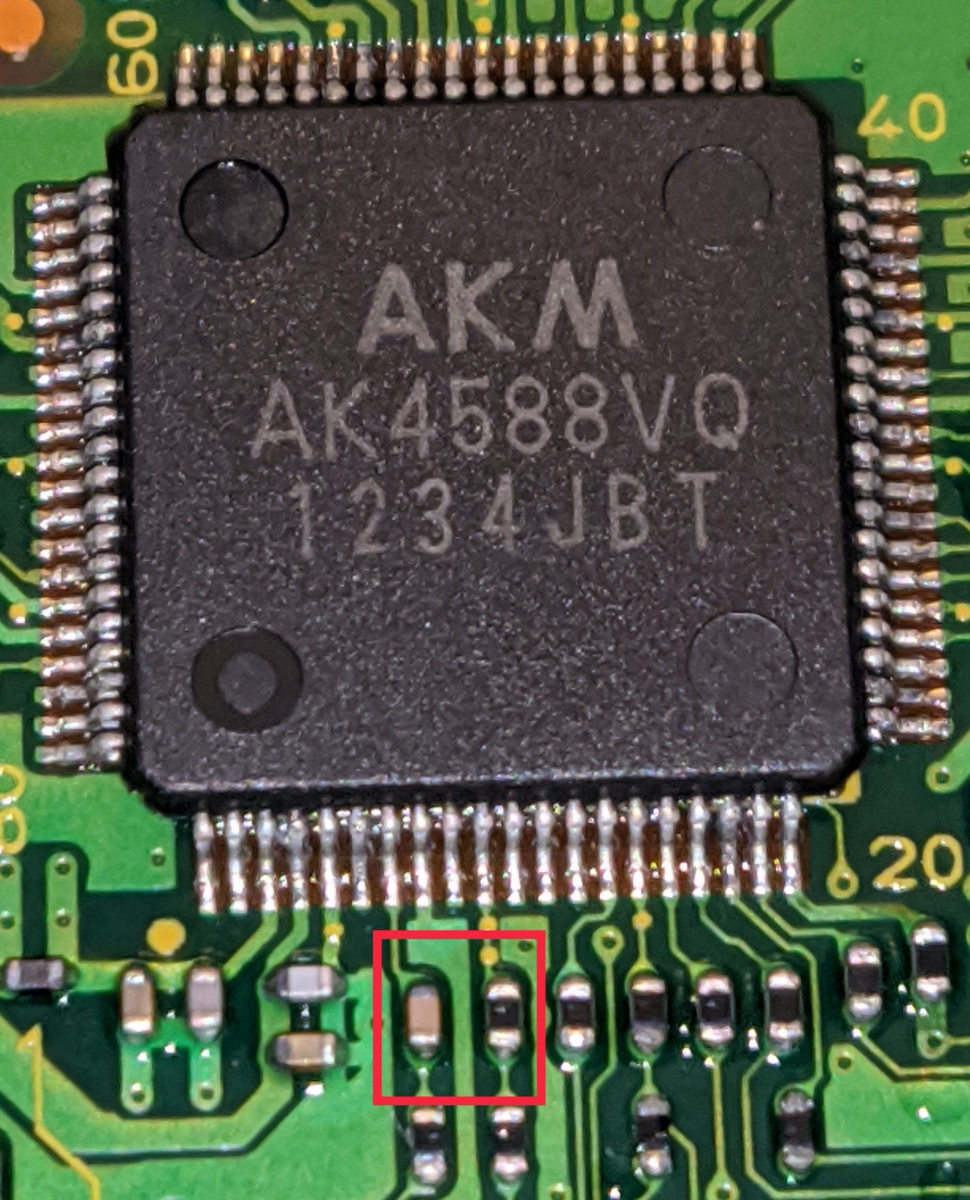 Такая проблема пропаивал обвязку AK4588VQ но случайно смахнул кондер, и резистор. 7 нога XTI, и 10 нога MCKO1.