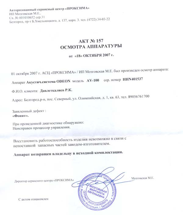 Абсолютно не гоню на СЦ, просто констатирую факт что в ремонте отказано. А про процессор - не моя придумка, а цитата из справки выданной СЦ. Так же на словах мастер рассказывал, что подобные глюки с фоном в сателитах связаны именно с процессором, а всякие фокусы с кондерами и цепями питания могут помочь при низкочастотном фоне, идущем именно от саба. Типа это глюк совсем старых Одеонов а в моем эта недоделка устранена изначально. Говорит что перепробывал все, обращался в главный СЦ в Москве, выслали инструкцию где написано тож самое - заменить процессор. Магазин обещает привезти еще один АВ-100 и заменить мне, но вот сомневаюсь что в нем не будет такой же проблемы. Если Вам известнен способ борьбы с дефектом моих колонок (а я уверен что известен), то будьте любезны - сообщите. Буду очень благодарен.