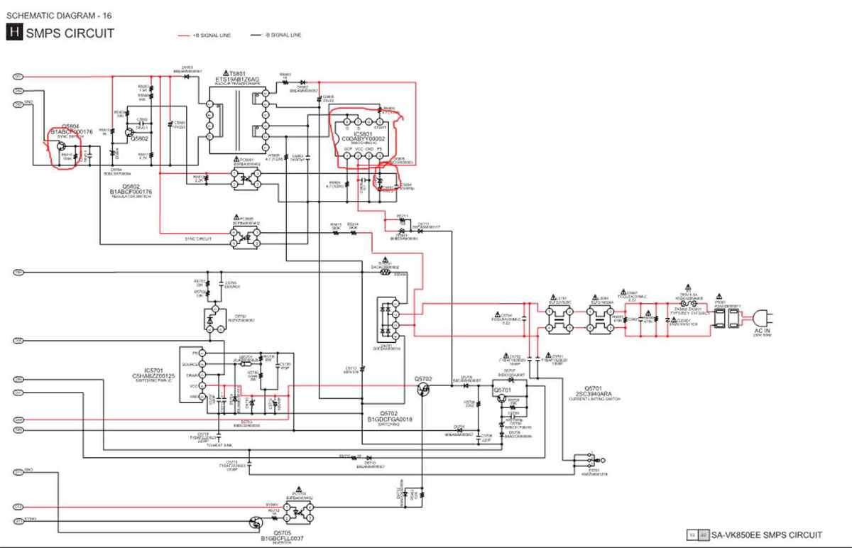 В питателе - дежурка - сгоревшая STR-A6159 , стабилитрон D5805 5,6V /BOBC5R600003/и транзистор Q5804 /B1ABCF000176/ Даташит на транзистор не нашёл и заменил на транзистор с такой-же проводимостью.Так-же сгоревшим был предохранитель /резистор/ FR5901. Сгоревшие детали на схеме обведены. В результате 6V появилось На схеме после диода D5803 почему-то написано 16V, а на разъём CN5902 приходит уже как SYS6V.В собранном состоянии 6V не просаживается - доходит на основной плате до эм. Q2913. На коллекторе ноль. Схему основной платы ещё конкретно не изучил, но полагаю, что на базу этого транзистора должен поступать сигнал на включение с проца. В результате светодиод дежурки на лицевой панели не горит со всеми вытекающими. Копать основную плату, или что-то упустил в питателе?