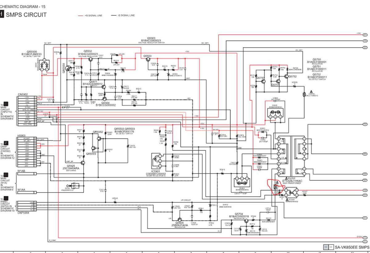 В питателе - дежурка - сгоревшая STR-A6159 , стабилитрон D5805 5,6V /BOBC5R600003/и транзистор Q5804 /B1ABCF000176/ Даташит на транзистор не нашёл и заменил на транзистор с такой-же проводимостью.Так-же сгоревшим был предохранитель /резистор/ FR5901. Сгоревшие детали на схеме обведены. В результате 6V появилось На схеме после диода D5803 почему-то написано 16V, а на разъём CN5902 приходит уже как SYS6V.В собранном состоянии 6V не просаживается - доходит на основной плате до эм. Q2913. На коллекторе ноль. Схему основной платы ещё конкретно не изучил, но полагаю, что на базу этого транзистора должен поступать сигнал на включение с проца. В результате светодиод дежурки на лицевой панели не горит со всеми вытекающими. Копать основную плату, или что-то упустил в питателе?