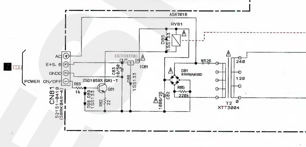 Доброго времени суток всем! Вкратце - была случайная подача постоянного напряжения на основной вход питания центра в районе 200 вольт, в результате чего сгорела первичная обмотка трансформатора дежурного напряжения XTT3004 (на скринах выход справа на схеме) . В просторах интернета нет информации, какое у него выходное напряжение, поэтому, ориентируясь на схему аналогичного центра (часть его схемы прилагаю), поставил трансформатор на 12V. В итоге индикатор дежурки горит, но при попытке включения центра с кнопки или пульта, запуска нет, слышен лишь слабый щелчок реле RY81, транзистор Q81 не открывается, на базе напряжение 0.8V, при прозвонке мультимером все переходы в норме. Стабилизатор IC81 в норме, 5.6V на выходе есть.