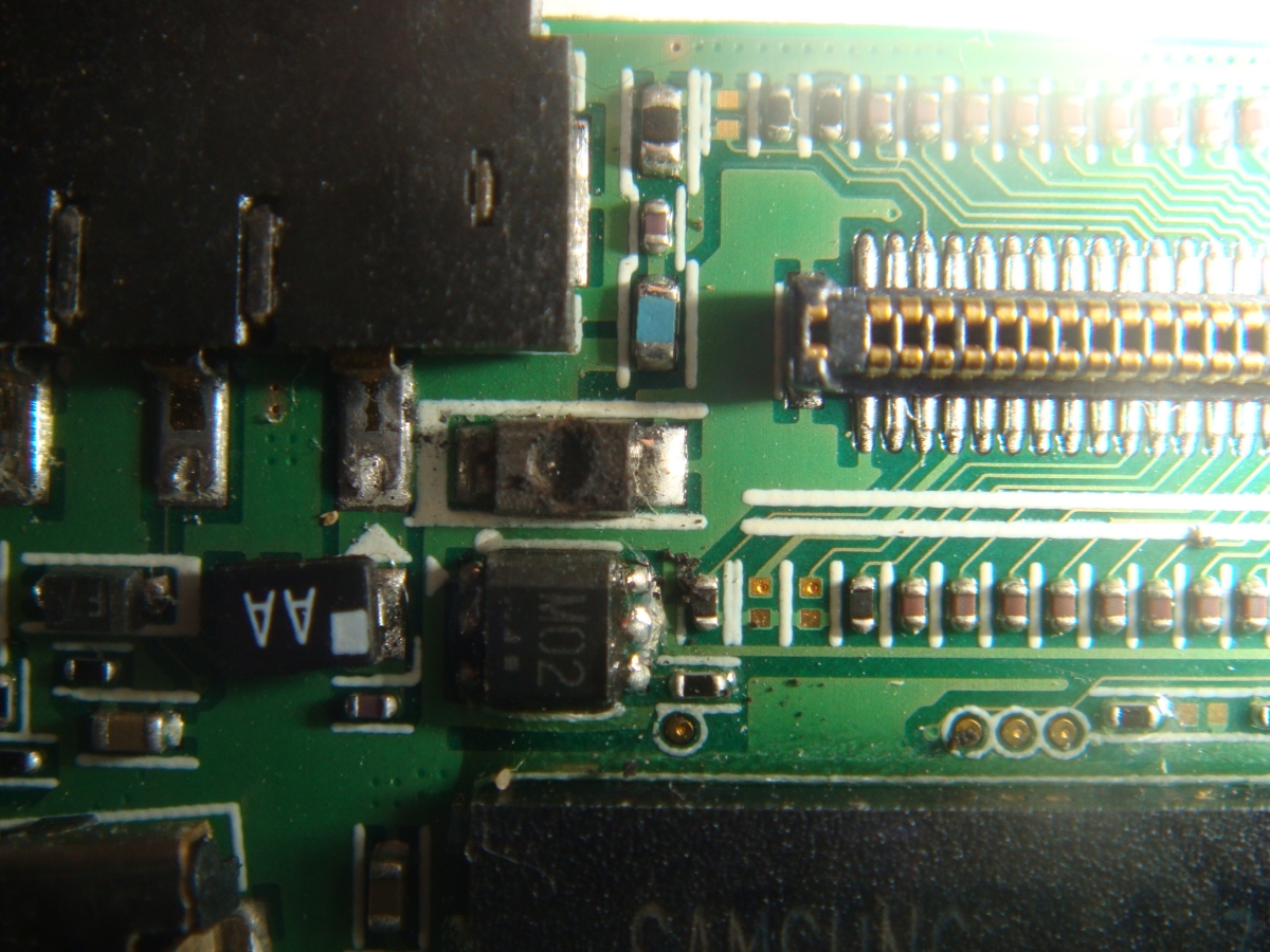 Телефон samsung e830!на телефоне такая проблема изредка когда вставляешь батарею экран блымает белым цветом!под микроскопом обнаружил выгоревшую плату схему не знаю как сказать!подскажите с какого тела можно снять и вообще из за этого ли дело?