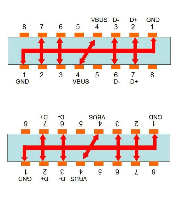 "Контакты для передачи данных, однако, совершенно отличаются, они асимметричны. То есть, если вы повернете коннектор, то они окажутся не в тех местах, где надо."