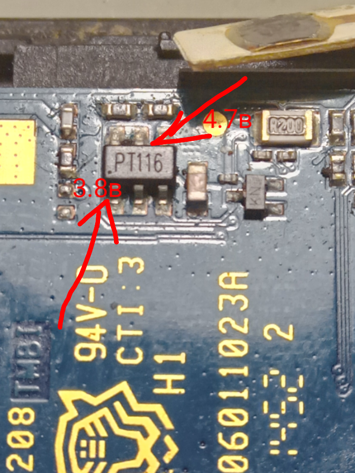 а может это и есть по названием TPS6116 она и есть pt116 но схема та его родная pt116 эта разве не контролер питание на некоторые ноги приходит на эти ноги 3.8в 4.7в ? она грется очень сильно а может что у меня лопнут резистор сейчас ток вообще не идёт без резистора а да этого он падал 0.45 и падал в ноль но при этом рт116 грелась может думаю за резистора ?