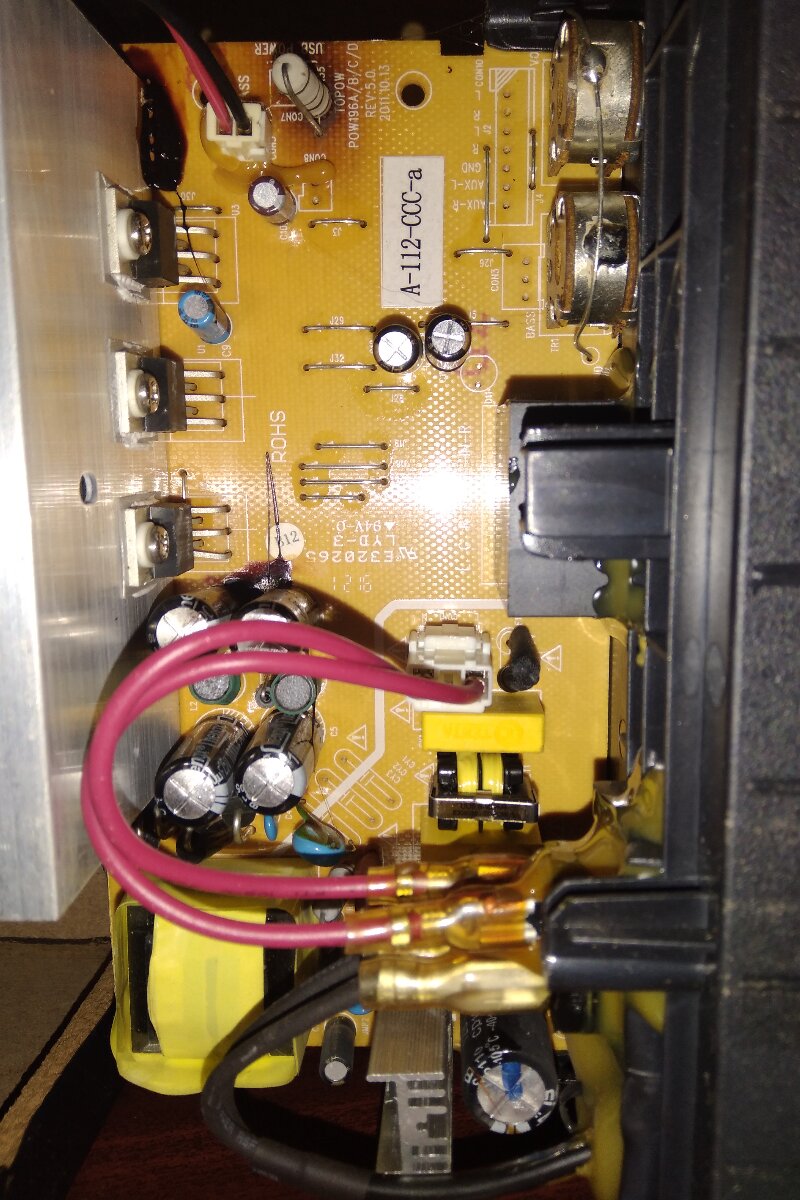 Загудели колонки, а точнее сабвуфер. Разобрал и сразу отпределилось повреждение, по закопченному следу.