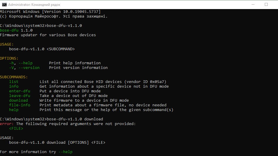 1. Запустить командную строку и подключить колонку с отключённым АКБ к ПК, ввести команду: bose-dfu-v1.1.0 enter-dfu.