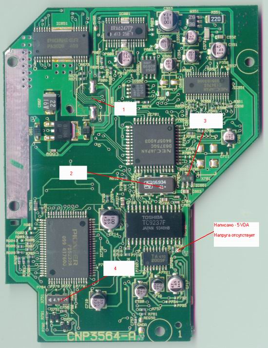 На прилепленной картинке в точках 4 и 2 кварцы молчат.В точке 3 похоже стоит стабилизатор - на нём тоже ничего,хвост от него идёт в точку 1,оттуда я снес кондюк 220х10 вольт для возможности отсканить,на нем тоже ничего,соответственно.
