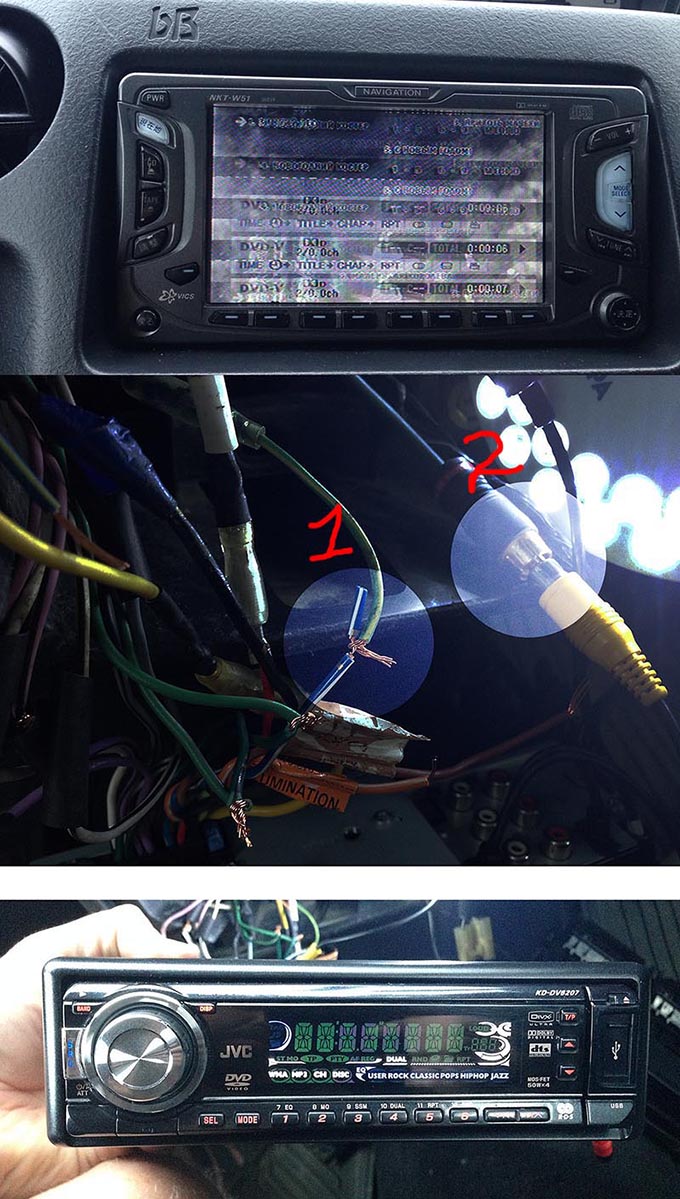 дело в том что у стоявшего панасоника помимо видеовыхода, был этот провод ("Провод управления видеосигналом"), а в JVC на этом месте дырка в разъеме, я пробовал подкинуть провод с японской магнитолы принудительно на этот контакт в JVC -результата нет.