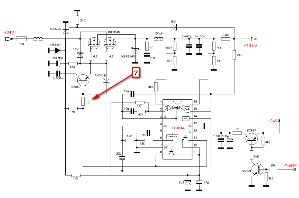 Собираю сейчас шим с 24в на 12в на Р-канальном полевом транзисторе,типа irf9540. Встали проблемы. Не могу добиться стабилизации на выходе Шима. Вот привожу схему, автор этой схемы утверждал,что схема работоспособная. Я единственное в ней изменил номинал резистора с 10 Ом до 10К в базовой цепи эмиттерного повторителя и добавил переменный резистор в эмиттерную цепь этого транзистора. (с Э на массу)