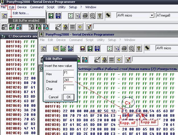 в первой ячейке (nF) хекс не трогаем, зато Decimal можно изменять как душе угодно, хоть на единицу, хоть сотнями, смотря на сколько врет в режиме измерения, я изменял сначала десятками а потом подгонял для точности уже единицами. Так же и со второй ячейкой.