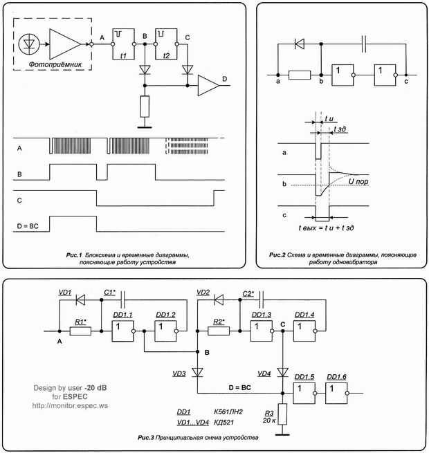 ЗЫ: в принципе, вместо одновибратора t1 можно использовать и одновибратор с временем импульса, несколько превышающим длину пачки импульсов команды, без перезапуска. Но такой вариант применим только с каким-либо конкретным пультом с одинаковой "битностью" команд (неприменим, например, для пульта RMT-V198D от видеомагнитофона SONY SLV-717, имеющего "комплексные" команды, задающие последовательность сразу нескольких действий. Длина посылки такой команды - фактически, посылка нескольких команд одним пакетом - в 2-3 раза превышает длину посылки обычной одиночной команды). Применив таймер с перезапуском и со временем импульса, чуть больше одного такта команды, я пытался добиться универсальности девайса - совместимости с большинством пультов ДУ.
