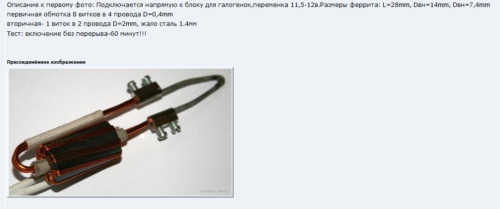 собрал вот такую конструкцию с разницей в размере ферита. у меня 20х12х7мм и первичной обмотки-11 витков.в качестве жала медная проволка 0.8мм,за 10секунд нагревается феритовый каркас градусов до 80.Скажите,для этой конструкции это естественно?.Питание от импульсного блока питания 12В 200ватт для галогенок