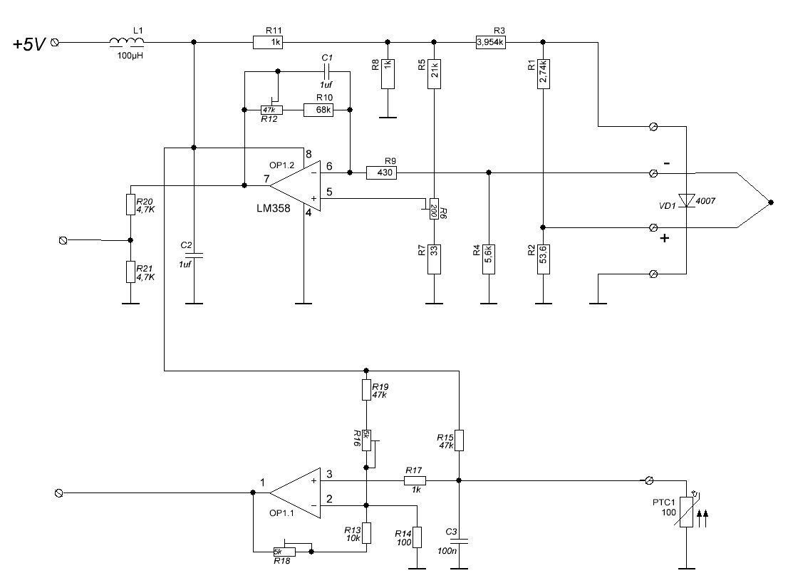 | bezotveta3raza, а два датчика термокомпенсации зачем? Один диод, а второй терморезистор. |