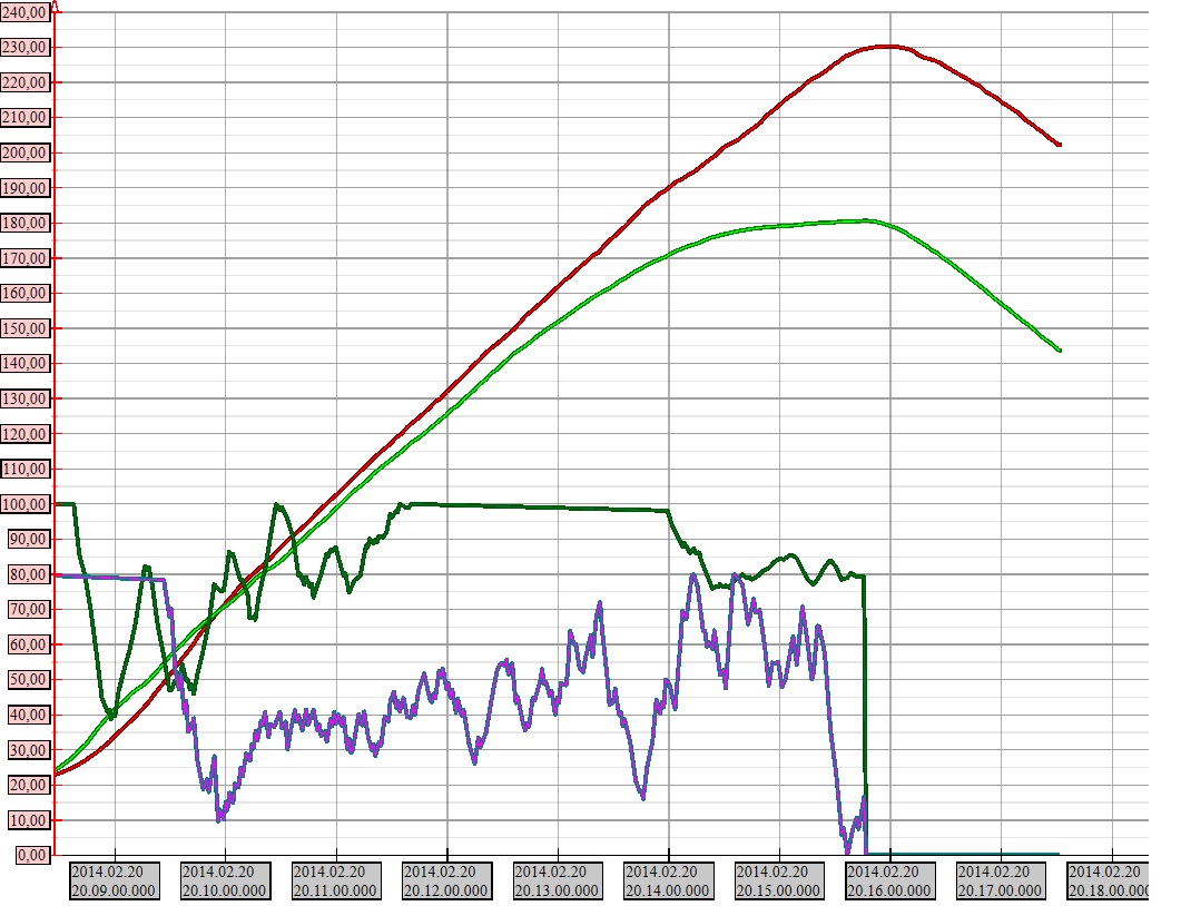 vvk-electron, может мой график чем то поможет, обратите внимание на изменения мощности(внизу графика, зелённый низ 100гр.=100%), низ 2кв-кварц,верх керамика-300вт, датчик низа- медная пластина под платой. После 100гр низа. мощность увеличивается на 20%,и уменьшается на 20% при стабилизации, отсюда вывод получить линейный нагрев с одной номинальной мощностью невозможно.