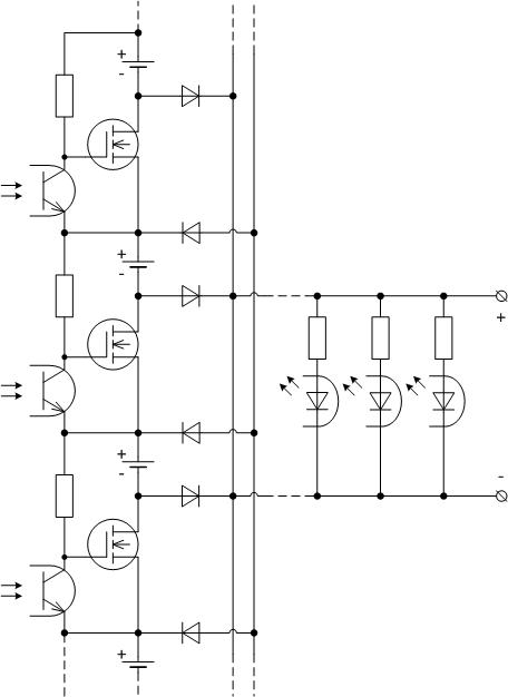 Ну, ПРИБЛИЗИТЕЛЬНО так (переделка прежней схемы на управление MOSFETами)... Именно ПРИБЛИЗИТЕЛЬНО, поскольку накидал влёт, и недочётов тут может оказаться туева хуча. Впрочем, одну лажу и сам вижу: силовое питание на диоды должно подаваться с задержкой относительно светодиодов оптронов, иначе через открытые MOSFETы и диоды будет "утекать" весь ток ЗУ, а светодиоды оптронов не зажгутся никогда. След-но, надо ставить ещё один ключ с задержкой - между светиками оптронов и остальной схемой. В общем - сначала закрыть ключи, потом - подавать силу на диоды... Можно, конечно, ещё покумекать, мабуть и ещё где-то баги есть, но головоломка интересна только до тех пор, пока она - головоломка, а если это практический проект - это дело уже должно окупаться.
