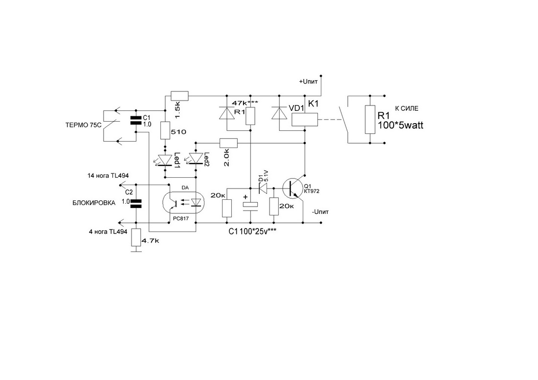 Схема блокирует импульсы на выходе ТЛКИ при сработке термореле,на время заряда литов по силе и мониторит источник питания на предмет провала напряжения.Светодиод Led1 загорается при сработке термоконтакта и происходит блокировка TLки.На время зарядки С1 микросхема также блокируеться горит Led2 до момента сработки реле. Делитель в цепи транзистора подбирается(R1) так ,что бы при уменьшении напряжения рабочего на 1-1.5 вольта реле отключалось и соответственно загораеться Led2 сигнализирует что с питанием проблемы и происходит также блокировка микросхемы.Подбором С1 выставляется время срабатывание реле(обычно 1.5-2 сек)хватает для заряда литов питания.