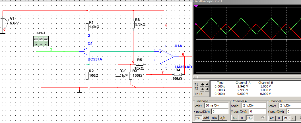Зелёная линия это входное напряжение от 1 до 4 вольт, красная линия это выходное напряжение от 0 до 3 вольт. Входному напряжению в 1 вольт соответствует выходное в 3 вольта, входному напряжению 4 вольта соответствует выходное напряжение в 0 вольт.
