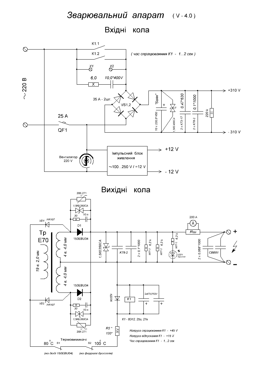 Всем привет! Сгорел почему-то при настройке адским пламенем варистор 20К271. Настроил на пониженном питании +60В резонанс 23…24 кГц, - выставил 23,2кГц, зазор дросселя занижен пока, около 0,5мм. Дал полную силу +310В, нагрузку 0,165 Ом, макс. заполнение, - получил максимум 120А и через несколько секунд задымел один из варисторов, сапрессоры на диодах оба теплые. Схемы прилагаю, транс Е70 19/4+4, дроссель Е65 12 витков. Может, когда увеличу зазор в дросселе (для получения желаемых 160А), частота резонанса подымется килогерц на пять, тогда и выбросы поубавятся? Кто что посоветует, - менять варистор и дальше в бой?