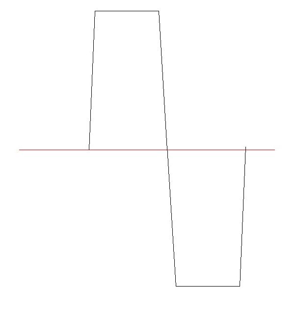 | сигнал на полуобмотке вторички будет примерно такой при максим заполнении относительно линии развертки осла.Такой же сигнал будет на первичке моста но надо мерять с делителем 1/100 на осле Если что то не так то ищи косяки. никаких выбросов.Вершина импульса может иметь небольшую ступеньку процента 2-3 от амплитуды. на ескизе указан полный период!!!